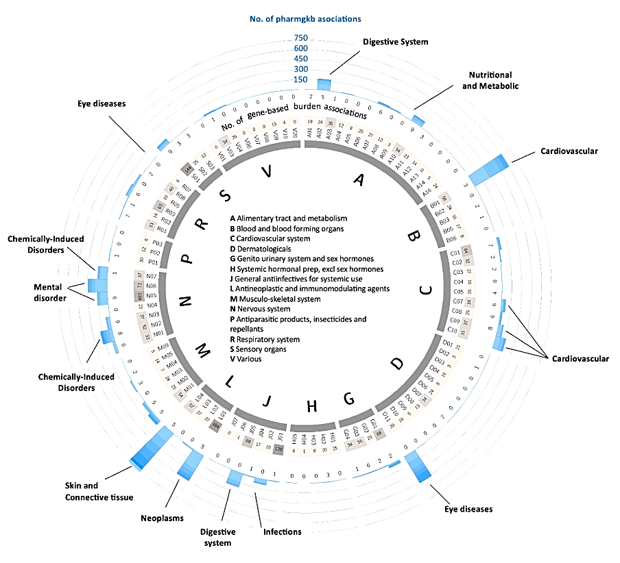 Distribution of drugs, annotated drug label associations, and burden test associations in PGxDB across 14 anatomical categories from the Anatomical Therapeutic Chemical (ATC) classification. The ATC classification system classifies approved drugs with a seven-digit code divided into five levels. The second layer shows a histogram representing the count of drugs within each of the 93 therapeutic categories. The third layer displays the number of Genebass PGx associations for missense variants with a p-value less than 0.05. The outer-most layer displays the number of drug-label annotations from PharmGKB (filtered for significant findings below a p-value threshold of 0.05) as a stacked histogram representing 25 disease classes, with darker columns indicating a higher number of diseases in that class. The most frequent disease in each class is annotated by name. The figure was generated using Circos